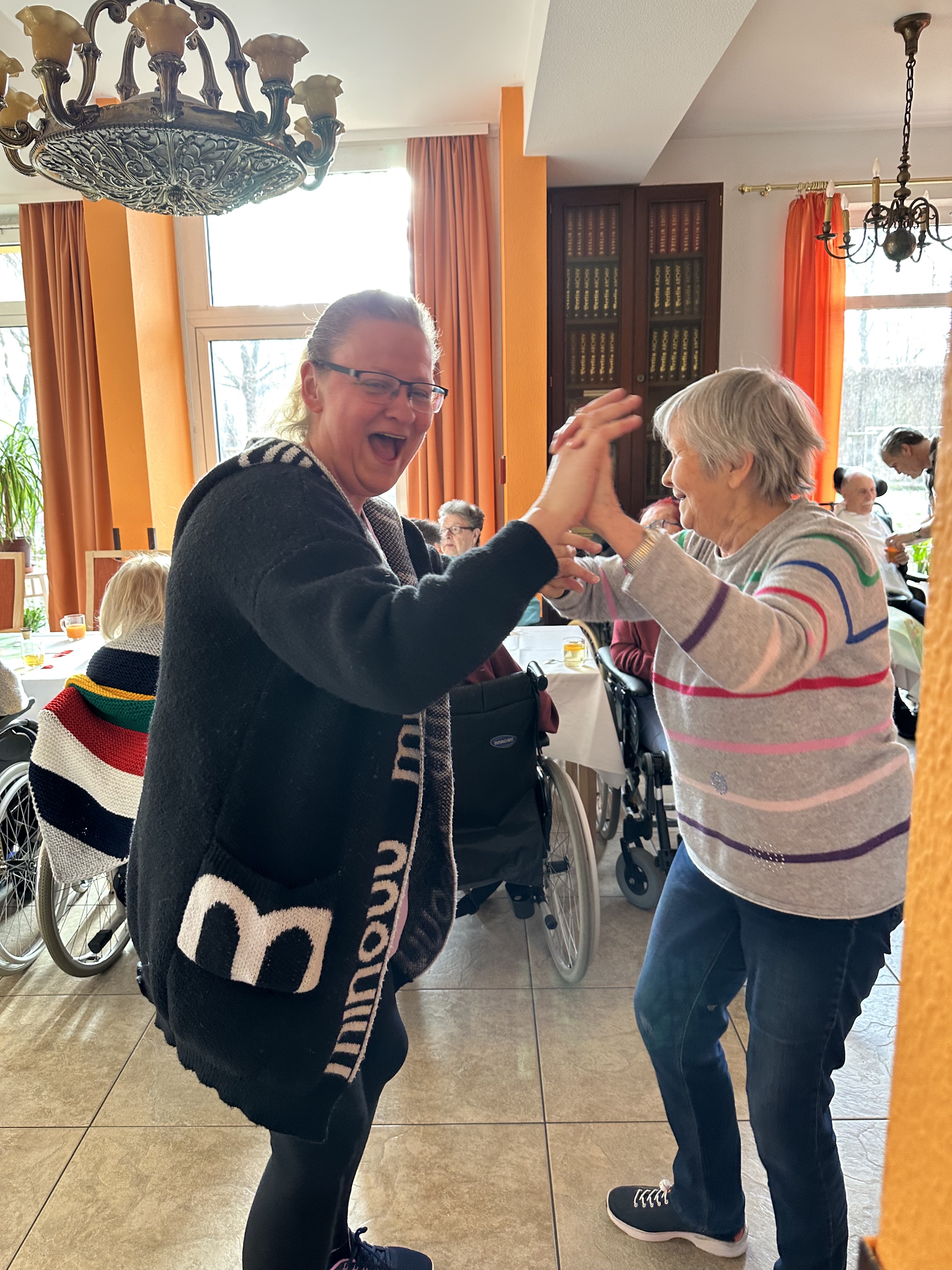 Unsere engagierten Betreuungskräfte hatten ein abwechslungsreiches Programm vorbereitet: Gemeinsam mit den Bewohnerinnen und Bewohnern wurden bekannte Frühlingslieder angestimmt, es wurde geschunkelt, gelacht und gesungen. Für die musikalische Untermalung sorgte Joe, der mit seiner mitreißenden Musik die Tanzfläche schnell zum Zentrum des Geschehens machte. Viele Gäste ließen sich vom Rhythmus anstecken – es wurde getanzt, geklatscht und gefeiert.